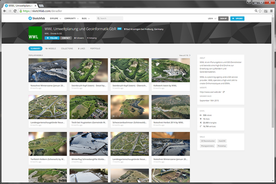 Unter www.sketchfab.com/deradler können Sie sich beispielhaft einige 3D-Geländemodelle als Ergebnisse unserer Drohnenbefliegungen ansehen.